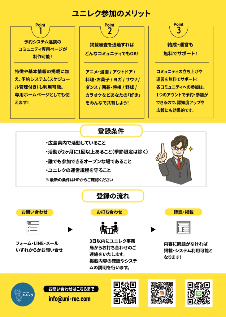 通常は『掲載』だけであり、活動への参加については各団体によることが多いですが、ユニレクへ登録されているコミュニティは全て『活動への参加方法(STORES予約)・連絡方法(Discord)・情報の閲覧(HP)』が統一されています。